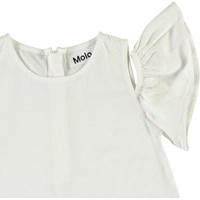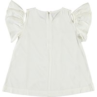 Refas is een wit shirt met korte mouwen die een lichte peek-a-boo schouder hebben. Het shirt heeft een ritssluiting aan de achterkant.