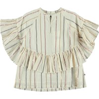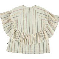 Renee is een lichtgekleurde top met metalen strepen en met ruches langs de borst en op de mouwen.