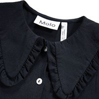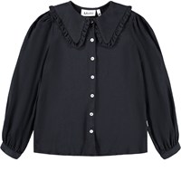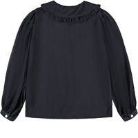 Zwarte viscose blouse dat zacht en comfortabel is om te dragen. De blouse heeft een Peter Pan kraag met decoratieve ruches, lange volumineuze mouwen met smalle manchetten en een knoopsluiting aan de voorkant met witte knopen.