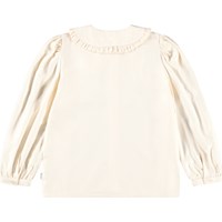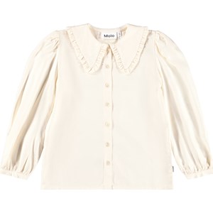 Crèmekleurig blouse gemaakt van zachte viscose wat het comfortabel maakt om te dragen. De blouse heeft een klassieke Peter Pan kraag met decoratieve ruches, lange volumineuze mouwen met smalle manchetten en een knoopsluiting aan de voorkant met witte knopen.