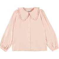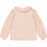 Robbin is een roze blouse met een grote kraag en een knoopsluiting.
