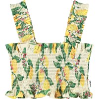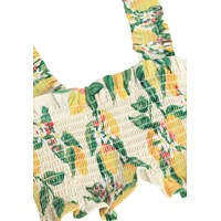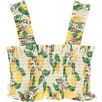 Gele crop top met citrusprint gemaakt van biologisch katoen met smockeffect, ruches en brede bandjes.