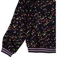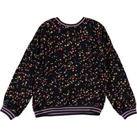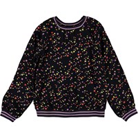 Romana is een zwarte trui met veel verschillende kleuren. De trui heeft een paars gestreepte boord.