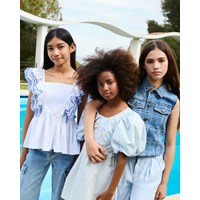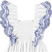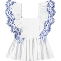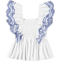 Witte topje van biologisch katoen met blauwe borduursels. Het topje heeft ruche mouwen met elastiek over de schouders, een vast schouderstuk aan de voorkant, ruche rand rond de taille en rimpels aan de achterkant, waardoor het comfortabel is om te dragen en de perfecte pasvorm garandeert.