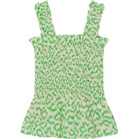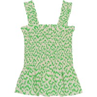 Groene katoenen topje met een luipaardprint. Het heeft een aansluitende pasvorm met mooie ruchesbandjes. Het topje heeft een elastische gesmokte lijfje, waardoor er aan de onderkant volume ontstaat.