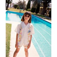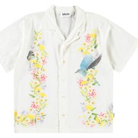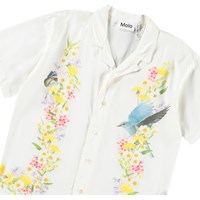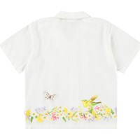 Oversized lichtgroene blouse met korte mouwen van zacht viscose met kraag en knopen aan de voorkant. De blouse heeft een print van een wilde bloemenkrans met vlinders en vogels die van de voor naar de achterkant gaat.