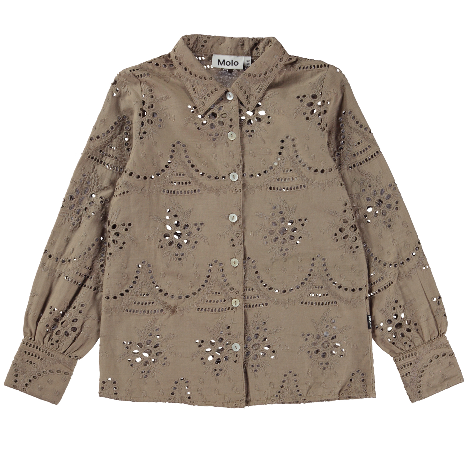 Beige blouse in broderie anglaise. Deze blouse is van 100% katoen, heeft lange mouwen, een kraag, een knoopsluiting aan de voorkant met witte knopen en heeft een normale pasvorm. Voor de perfecte set draag je het met de Biana rok die van dezelfde kleur en stof is.