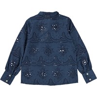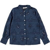 Donkerblauwe blouse in broderie anglaise. Deze blouse is van 100% katoen, heeft lange mouwen, een kraag, een knoopsluiting aan de voorkant met witte knopen en heeft een normale pasvorm. Voor de perfecte set draag je het met de Biana rok die van dezelfde kleur en stof is.