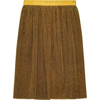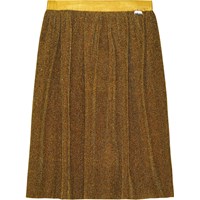 Geplooide rok in gouden glitter. De rok heeft een elastische tailleband, zodat hij zowel hoog in de taille als op de heupen gedragen kan worden. De rok heeft een lengte tot halverwege de kuit en valt prachtig door de plooien.