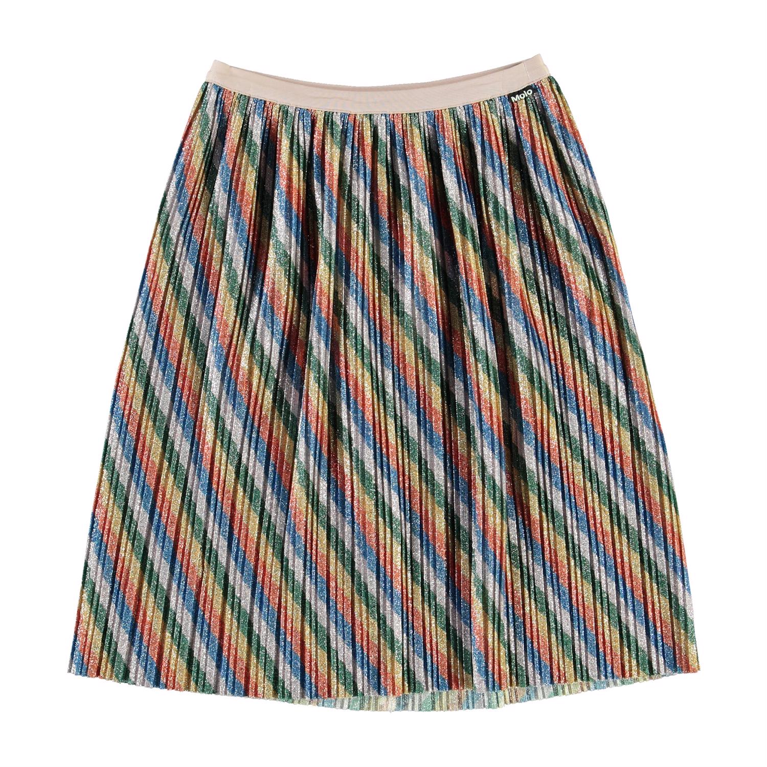 De Bailini rok is een van Molo's favorieten en ziet er geweldig uit op feestjes, maar het is ook perfect om elke dag te dragen met een casual T-shirt. Het is geplooid en heeft regenboogstrepen met glitters. De rok heeft een elastische tailleband.