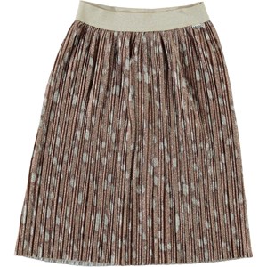 De plooirok van Bailini is een favoriet van Molo die geweldig is voor feestjes, maar ook voor dagelijks gebruik met een casual top. Het is bronskleurig met witte stippen en glitter. Het heeft een beige elastische tailleband.