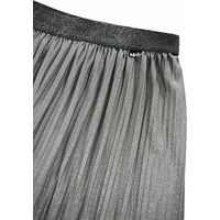 Geplooide rok in grijs glitter. De rok heeft elastiek in de taille, zodat het hoog in de taille of op de heup gedragen kan worden. De rok heeft een lengte tot halverwege de schenen en valt prachtig.