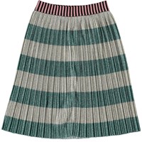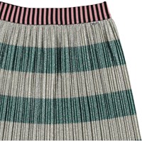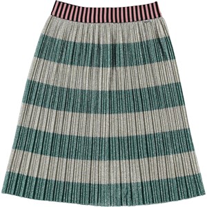 De plooirok van Bailini is een favoriet van Molo die geweldig is voor feestjes, maar ook voor dagelijks gebruik met een casual top. Het is geplooid en heeft groene en grijze strepen met glitter. De rok heeft een lichtroze en blauwe gestreepte elastische tailleband.