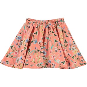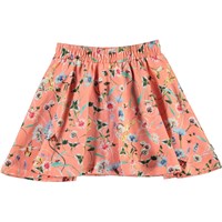 Barbera is een koraalkleurige rok met een print van wilde bloemen en insecten. Het is een volle rok met een elastische taille.