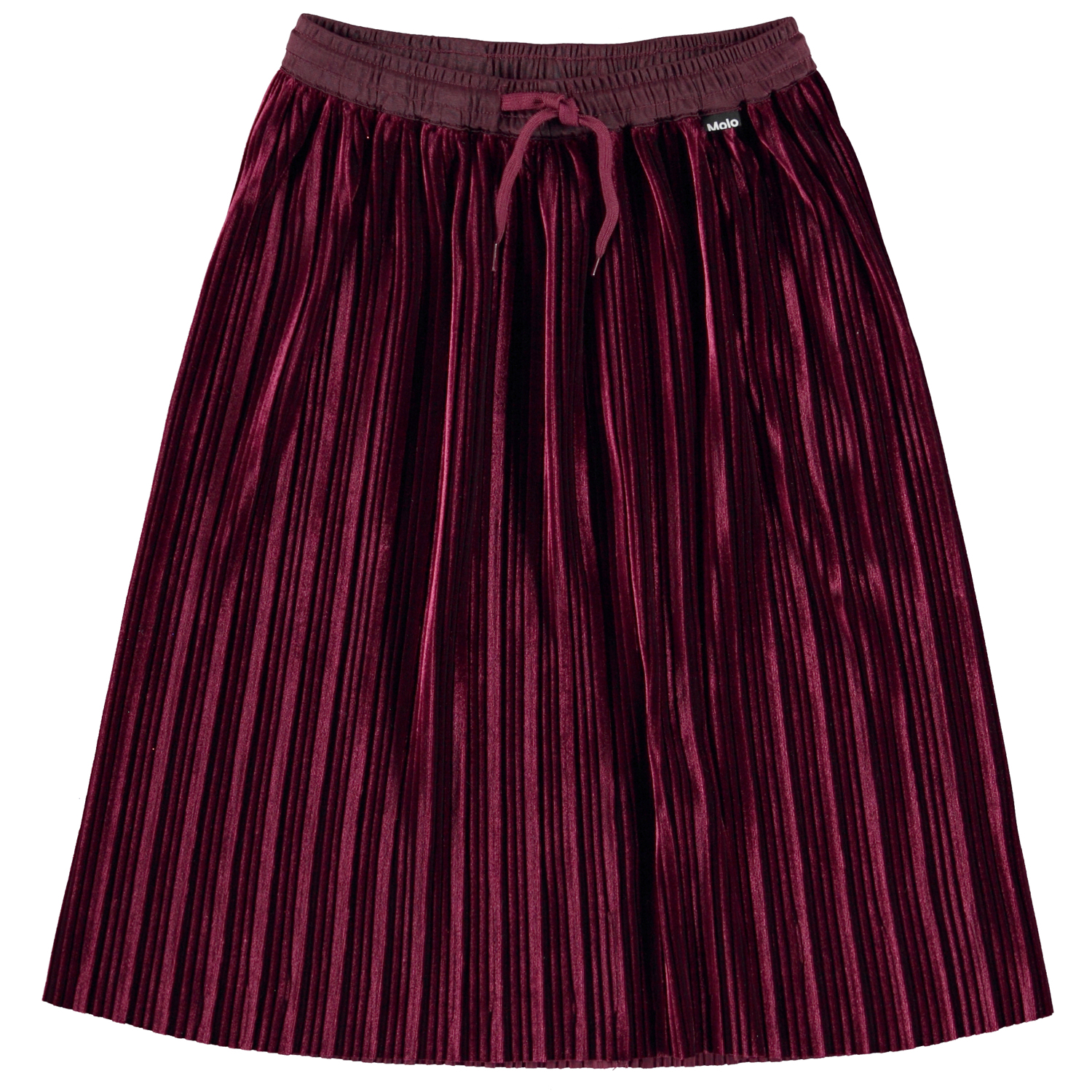 Becky is een lange geplooide donkerrode rok. De rok heeft een elastische taille met koordjes die de jurk enorm comfortabel maken.