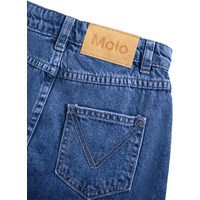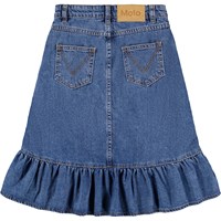 Blauwe spijkerrok gemaakt van biologisch katoen met ruches. De rok is op knielengte aan de voorkant en langer aan de achterkant, de taille heeft riemlussen, knoop- en ritssluiting en een interne elastiek in de taille om de juiste pasvorm voor alle kinderen te garanderen. De rok heeft zowel voor- als achterzakken.