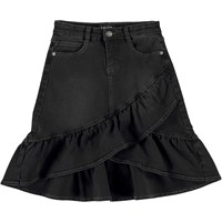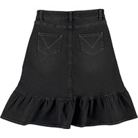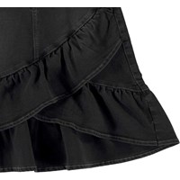 Belinda is een zwarte spijkerrok met een wikkeleffect. Het heeft een ruche rand aan de onderkant. De rok heeft een knoopsluiting en riemlusjes.