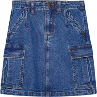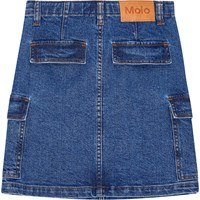 Blauwe spijkerrok van biologisch katoen. De rok is knielengte, heeft een normale pasvorm en de taille is voorzien van riemlussen, een knoop- en ritssluiting, evenals een interne elastische tailleband die zorgt voor de juiste pasvorm voor alle kinderen. De rok heeft voor- en achterzakken, evenals grote cargozakken aan de zijkanten.