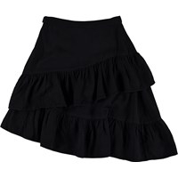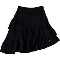 Benedicte is een lange zwarte asymmetrische rok in verschillende lagen. Het heeft een ritssluiting aan de zijkant.