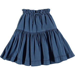 Bente is een blauwe rok die lang is en een elastische taille met koordjes heeft.