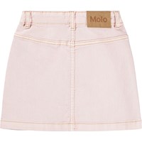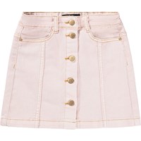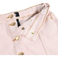 Roze spijkerrok met goudkleurige drukknopen tot maat 140, daarna wordt het vastgemaakt met klassieke jeansknopen. De rok komt tot halverwege de dij en heeft een taille met riemlussen, voorzakken en een intern verstelbaar elastiek, zodat de pasvorm gemakkelijk kan worden aangepast.