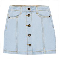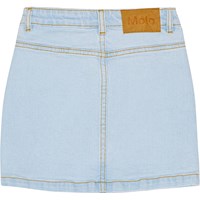 Lichtblauwe spijkerrok met aan de voorkant knopen. Het heeft riemlusjes en zakken. De rok heeft mooie details vanaf de zakken aan de voorkant.