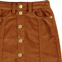 Bera is een bruine corduroy rok met een knoopsluiting aan de voorkant. Het heeft riemlussen en zakken aan de voorkant.