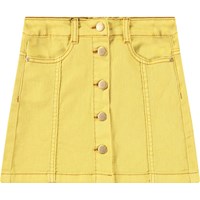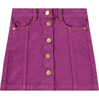 Paarse spijkerrok met goudkleurige knopen voor de sluiting. De rok komt tot halverwege de dij en heeft een taille met riemlussen en zakken aan de voorkant. De stijlvolle pasvorm is voorzien van gedetailleerde stiksels die van de zakken naar beneden lopen.