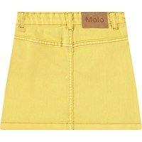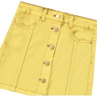 Gele spijkerrok met goudkleurige knopen voor de sluiting. De rok komt tot halverwege de dij en heeft een taille met riemlussen en zakken aan de voorkant. De stijlvolle pasvorm is voorzien van gedetailleerde stiksels die van de zakken naar beneden lopen.
