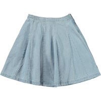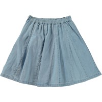 Berthe is een lichtblauwe rok van biologisch chambray katoen. De rok heeft een spijkerrok look en heeft rijen verticale panelen met franse naden, waardoor het een mooie breedte heeft. Berthe heeft een vastgenaaide tailleband aan de voorkant en elastiek aan de achterkant. Het heeft een ritssluiting aan de zijkant, waardoor het comfortabel zit.