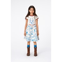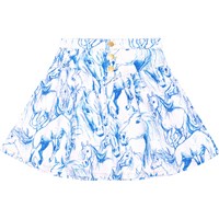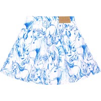 Witte spijkerrok met een print van blauwe handgetekende paarden. Het heeft een mooie bovenstuk die aan de voor- en achterkant in een punt uitloopt en een wijde geplooide rok. Het is knielang en heeft een knoopsluiting. De tailleband is verstelbaar met een elastiek aan de binnenkant, zodat het bij de meeste kinderen perfect past. Maten 92 t/m 134 hebben een knoopsluiting om het makkelijk aan te trekken, terwijl maten 140 t/m 176 een gewone jeansknoop hebben.