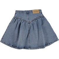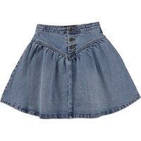 Blauwe spijkerrok met een bovenstuk die aan de voor- en achterkant in een punt overgaat. De rok heeft een gerimpeld effect dat helpt om volheid te creëren. Deze rok is van 100% katoen, heeft een knoopsluiting, valt op de knieën en heeft een normale pasvorm. De taille kan worden aangepast met een verstelbaar elastiek aan de binnenkant, zodat het perfect past bij alle kinderen. Maten 92-134 hebben een drukknoop om het aan- en uittrekken makkelijker te maken. Maten 140-176 hebben een gewone jeansknoop.