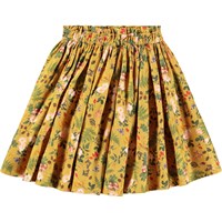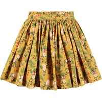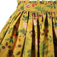 Gele rok gemaakt van biologisch katoen met een print van noten, bessen en bloemen die de rok volgt. De rok is op knielengte met een tailleband die elastisch is aan de achterkant waardoor het gemakkelijk is aan te trekken en comfortabel om te dragen.