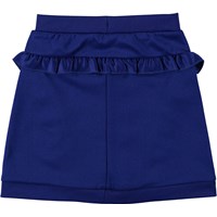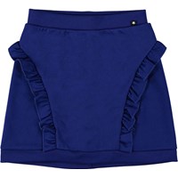 Beverly is een blauwe rok met ruches en een elastische ribboord rond de taille en onderaan.