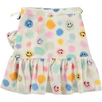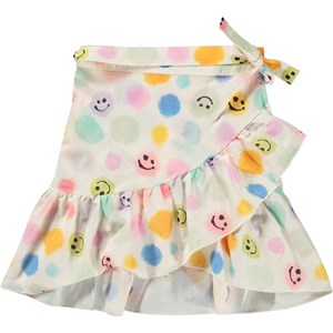 Wikkelrok van 100% biologisch katoen met een print van pastelkleurige stippen, waarvan sommige emojis zijn. De rok valt tot net boven de knie en heeft een golvende rucheboord. De rok heeft een makkelijke striksluiting in de taille, waardoor het perfect over je badpak past als je vanaf het zwembad of het strand naar huis gaat.