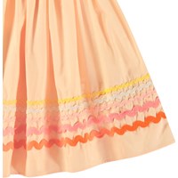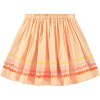 Perzikkleurige rok van biologisch katoen. De rok heeft een aansluitende tailleband met ritssluiting, een cirkelvormige patroon en plooien rond de taille. Het heeft kleurrijke golvende afwerkingen aan de zoom van de rok. Combineer de rok met het bijpassende shirt voor een complete set.