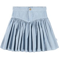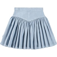 Mooie lichtblauwe rok gemaakt van biologisch katoenen fluweel. De rok heeft panelen aan de voorkant en plooien die de rok een mooie pasvorm geven. De rok heeft een knoopsluiting en een verstelbare taille.