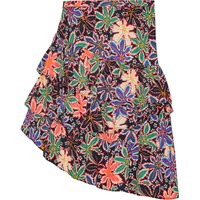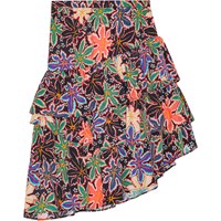 Zwarte geplooide rok van zachte en lichte viscose stof. De rok valt diagonaal en zachtjes over de knieën en de taille is voorzien van een zijrits, waardoor hij gemakkelijk aan te trekken is. De rok heeft een veelkleurige print van prachtige esdoornbladeren die mooi in elkaar overlopen.
