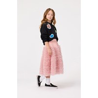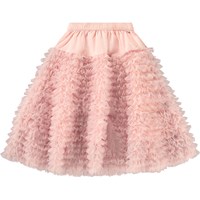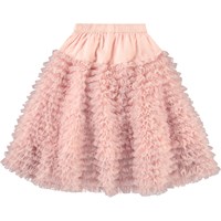 Roze tule rok met elastische tailleband. De rok komt tot halverwege de kuit en heeft een volumineuze pasvorm met meerdere lagen tule.
