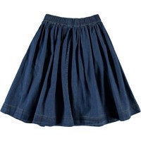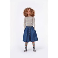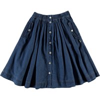 Bolette is een blauwe spijkerrok met een knoopsluiting en zakken aan de voorkant. De rok heeft een elastische tailleband.