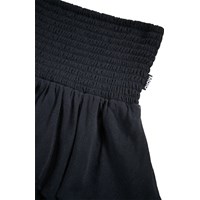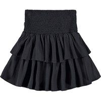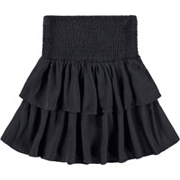 Zwarte knielange rok gemaakt van zachte viscose. De rok heeft een wijde taille met smokwerk, een volumineuze rok in twee lagen en golvende boorden aan de onderkant. De rok heeft een elastische tailleband waardoor het gemakkelijk is aan te trekken en comfortabel om te dragen.