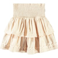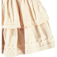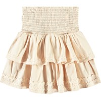 Beige knielange rok van biologisch katoen chambray. De rok heeft een brede tailleband genaaid met gerimpeld effect, met een volumineuze rok in 2 lagen en delicate golvende boorden aan de onderkant. De elastische tailleband maakt het gemakkelijk om het aan te trekken en comfortabel om te dragen.