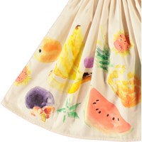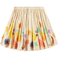 Lichtbeige knielange rok van biologisch katoen. De rok heeft een vaste taille aan de voorkant, terwijl het aan de achterkant elastisch is, waardoor het gemakkelijk aan te trekken is en comfortabel draagt. De rok plooit zich rond de taille, waardoor het een mooi volume krijgt. Het heeft een print van handgeschilderd fruit.