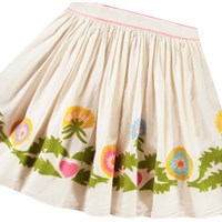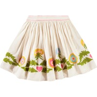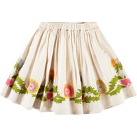 Lichtroze knielange rok van biologisch katoen. De rok heeft een vaste taille aan de voorkant, terwijl de achterkant elastisch is, waardoor het gemakkelijk is aan te trekken en comfortabel draagt. De rok plooit zich samen rond de taille, waardoor het een mooi volume krijgt. Hetj heeft roze accenten in de taille en geborduurde grafische paardenbloemen langs de onderkant. Combineer het met een bijpassend gilet.