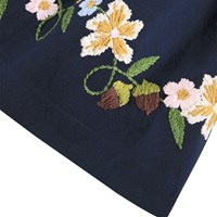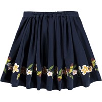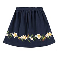 Donkerblauwe rok van katoenen keperstof met borduursel van bloemen en noten. De rok is op knielengte met een tailleband die aan de voorkant vastzit en aan de achterkant elastisch is waardoor het gemakkelijk is aan te trekken en comfortabel om te dragen.