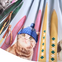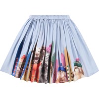 Lichtblauwe knielange rok gemaakt van biologisch katoen met een print van dieren op een skitrip. De rok heeft een vaste taille aan de voorkant en is elastisch aan de achterkant waardoor het gemakkelijk is aan te trekken en comfortabel om te dragen. De rok plooit rond de taille en geeft de rok een mooie volume.