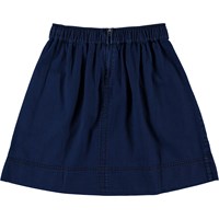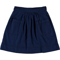 Bonnie is een blauwe rok in een zachte spijkerstof met opgestikte zakken aan de voorkant. De rok heeft een ritssluiting aan de achterkant.
