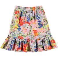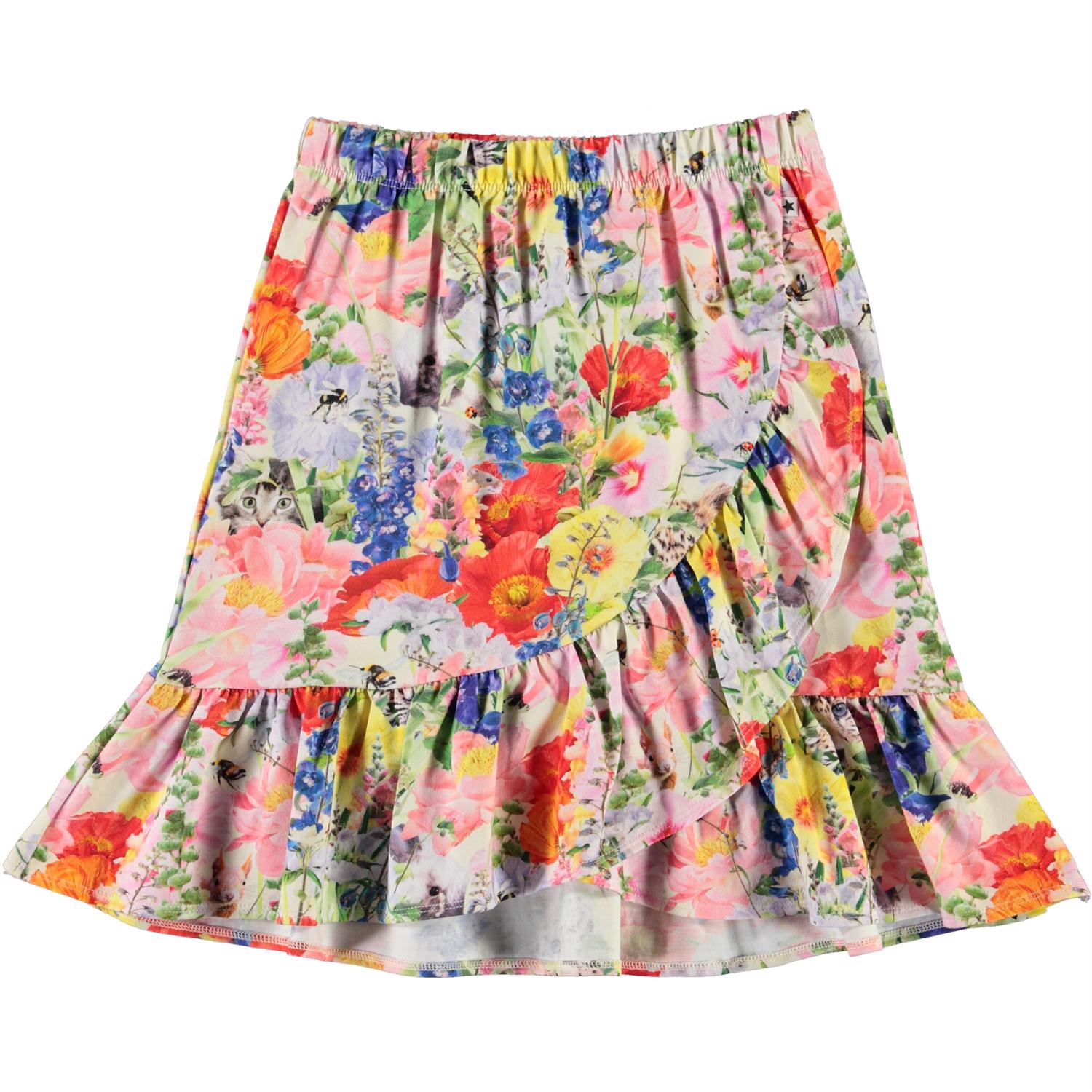Bradie is een wikkelrok met een elastische taille. Het heeft de print ‘Hide and Seek’ dat verstopt verschillende dieren tussen de bloemen.