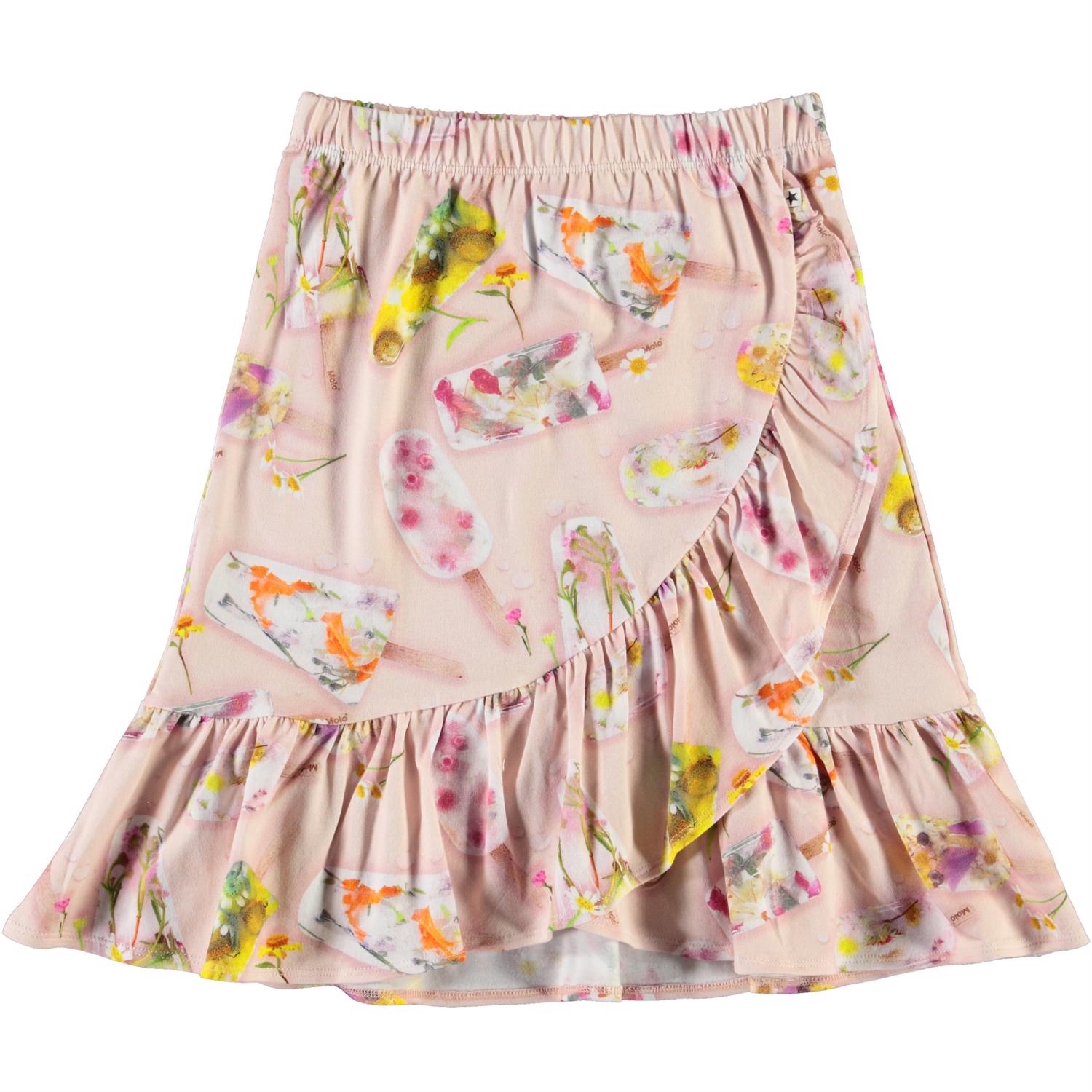 Bradie is een wikkelrok met ijsjes print en een elastische taille. Molo heeft bloemen ingevroren voor deze print.