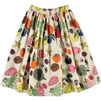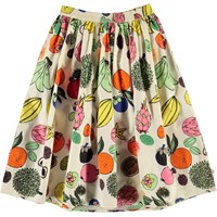 Bree is een lange rok met een tropische fruitprint. Het heeft een elastische taille voor een comfortabele pasvorm.